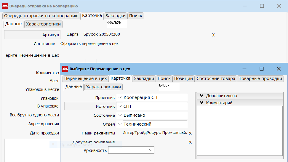 Затем кладовщик отдаст комплектующие/материалы по документу «Перемещение в цех» на склад кооператора