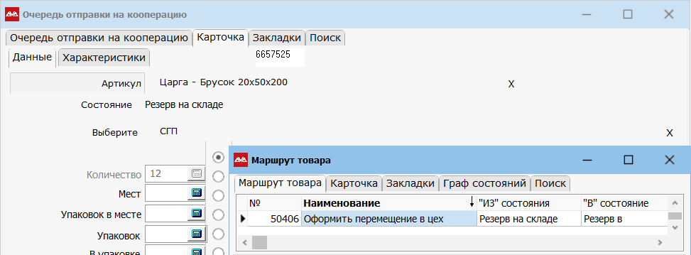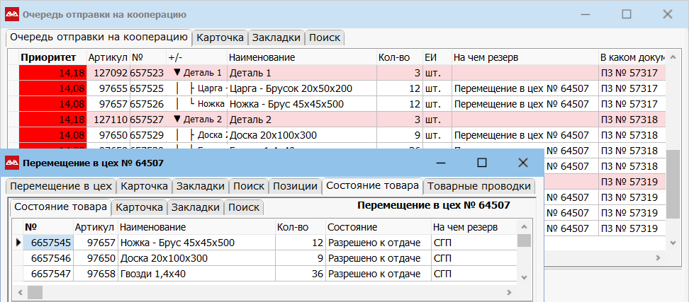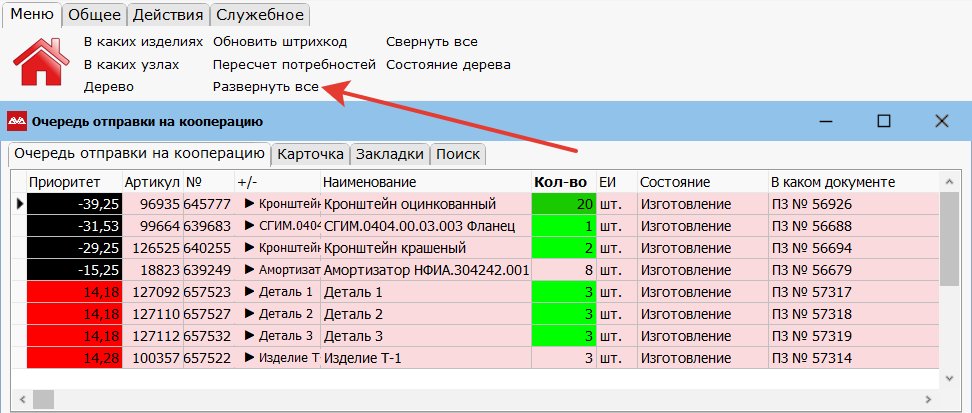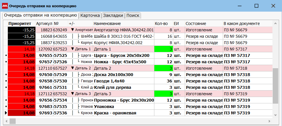 Если в очереди отправки на кооперацию ячейка с количеством детали окрашена в зеленый цвет, это значит, что все комплектующие/материалы находятся на нашем складе и можно их отправлять кооператору (оформлять перемещение в цех).