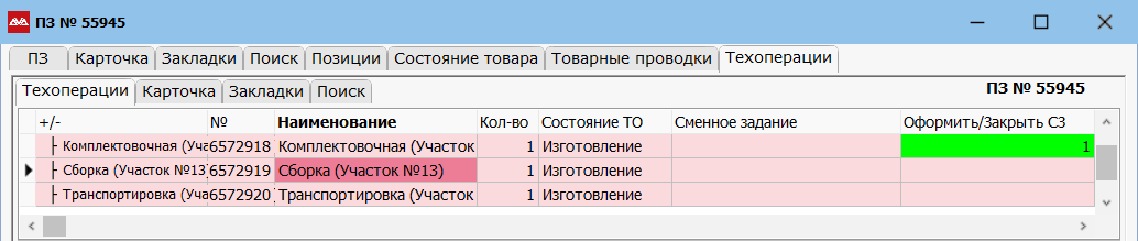 Если какой-то комплектующей не хватает на цеховом складе, система формирует перемещение в цех. Исполнение этого перемещения — это тоже работа комплектовщика. Как только «Комплектовочная» ТО загорелась зеленым, значит комплектовщик может приступать к комплектованию. Необходимо открыть ПЗ и проверить, все ли на цеховом складе или нужно часть комплектующих сходить забрать на питающий склад.