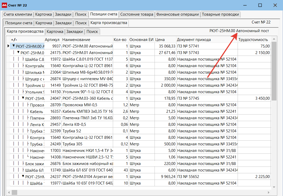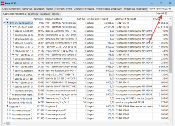 Для просмотра карты производства только конкретной отгруженной позиции счета, позиционируйтесь на ней, перейдите в «Закладки» и нажмите «Карта производства».