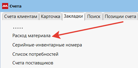 Чтобы посмотреть покупные материалы, использованные при производстве отгруженных изделий в счете, перейдите в «Закладки» и выберите пункт «Расход материала».