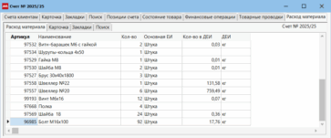 Откроется список всех полуфабрикатов/узлов/материалов/комплектующих, входящих в состав отгруженных изделий в счете.