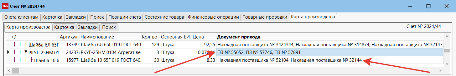 В колонке «Документ прихода» будут показаны соответствующие документы: