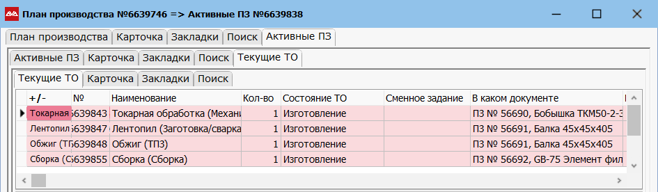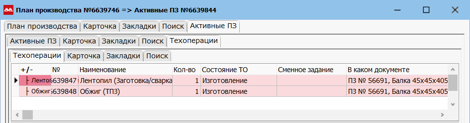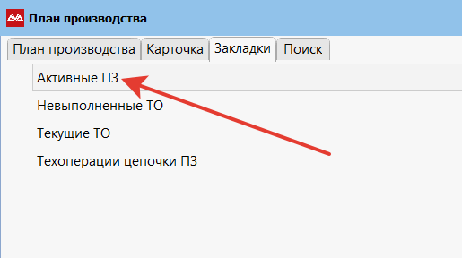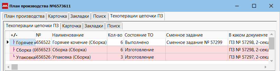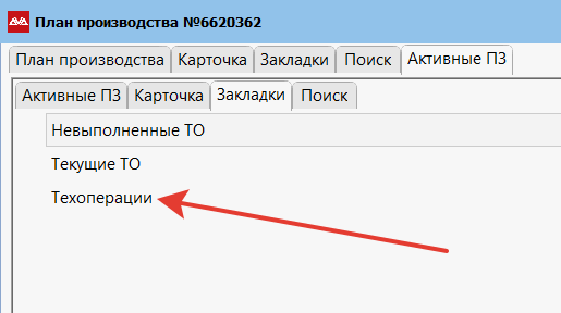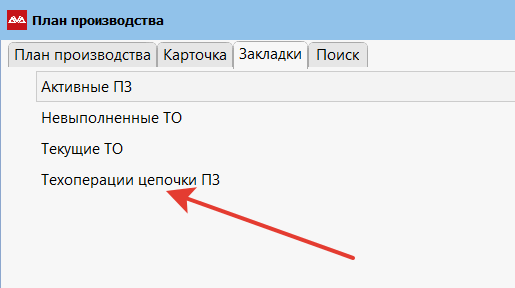 Если находясь на позиции в «Плане производства», перейти в «Закладки» и выбрать пункт «Техоперации цепочки ПЗ»,