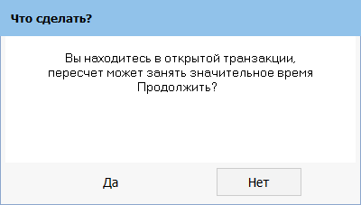 Если пересчет будет запущен в транзакции, то он будет происходить не в фоновом режиме, что может занять значительное время. О чем система предупредит вас, показав сообщение «Вы находитесь в открытой транзакции, пересчет может занять значительное время. Продолжить?». При таком пересчете вы не сможете работать в других формах программы.