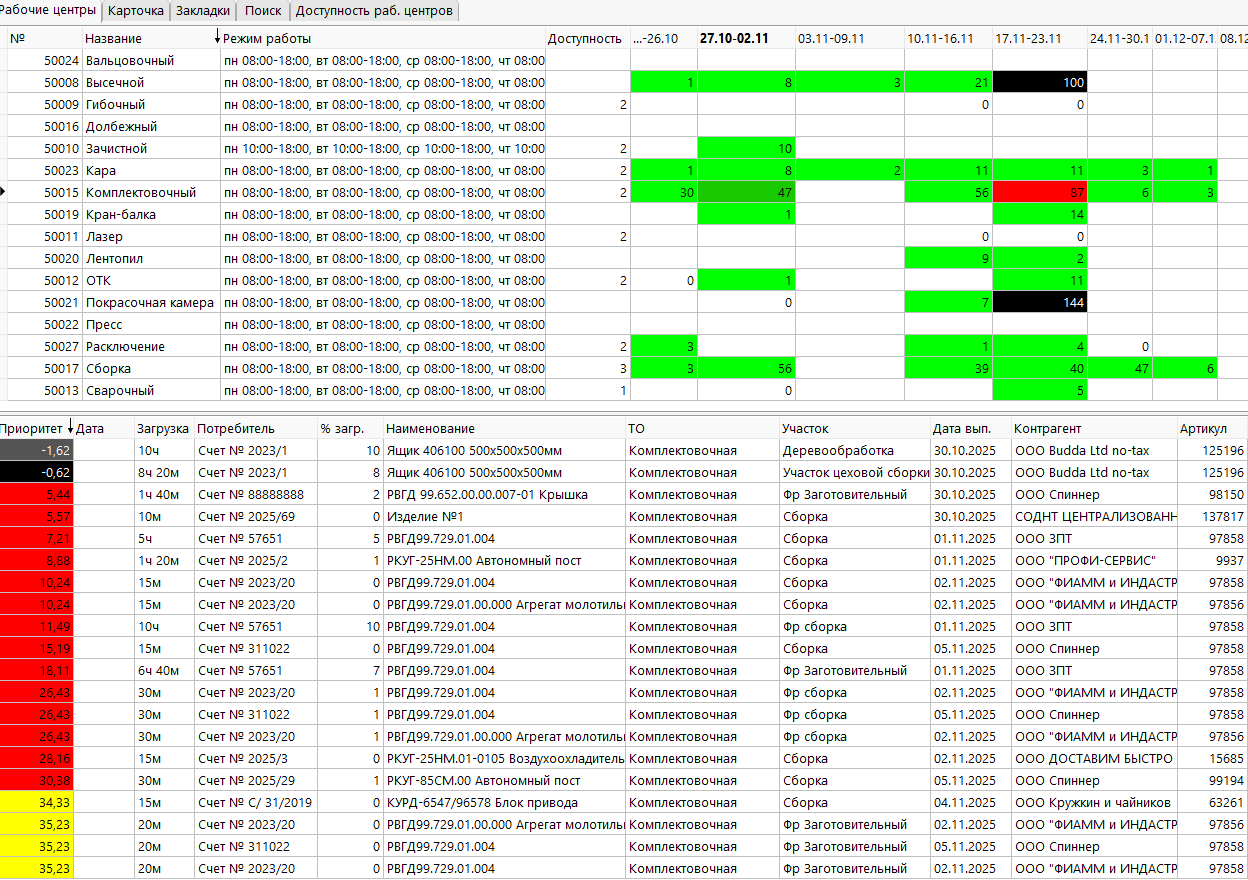 Непосредственно в этом справочнике показывается текущая загруженность рабочих центров, разбитая по неделям. В подвале показана детализация каждой недели.