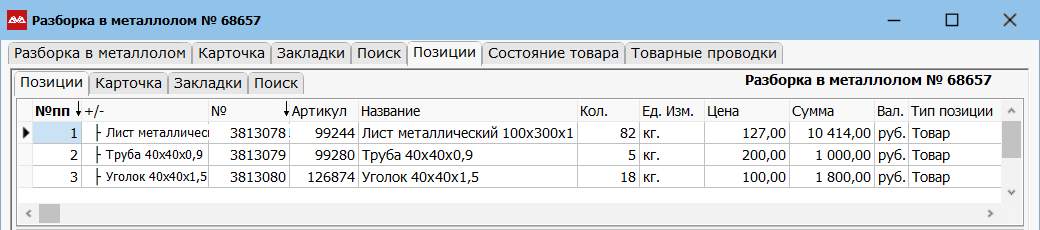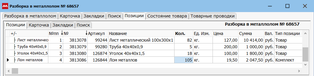 В «Позиции» занесите материалы, которые переводите в металлолом.