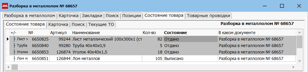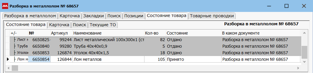 Позицию «Лом» отметьте пробелом и выполните движение «Разрешено к приему», затем кладовщик примет ее на склад отходов.