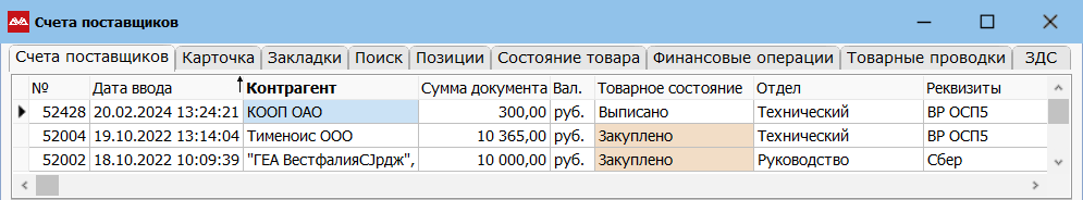 Программа покажет форму, где будут отражены счета поставщиков, уже привязанные к этому ПЗ, либо список будет пуст.