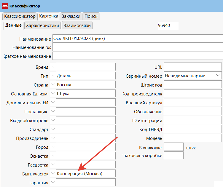 1. В классификаторе на карточке всех полуфабрикатов/изделий, исполняемых по кооперации, укажите участок Кооперации.