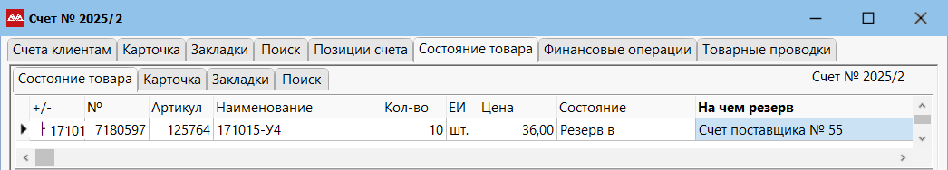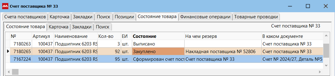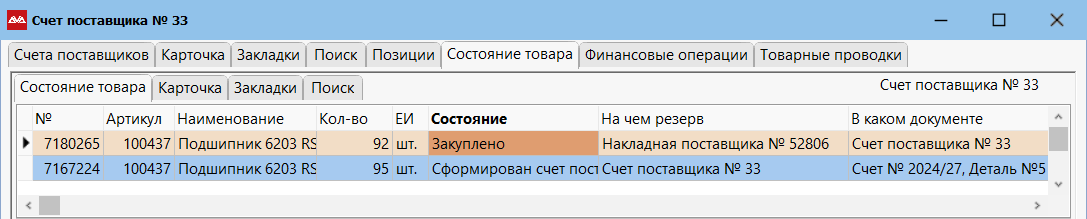 Встаем на этот СП в списке счетов поставщиков, переходим в «Состояние товара» (F6).