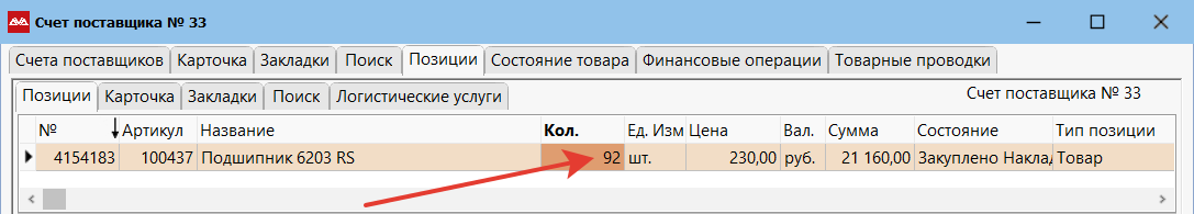 Встаем на нужную позицию, нажимаем корректировать запись (F2) или включаем редактирование данных в списке (F4), и уменьшаем количество до 92 штук. Сохраняем изменения.