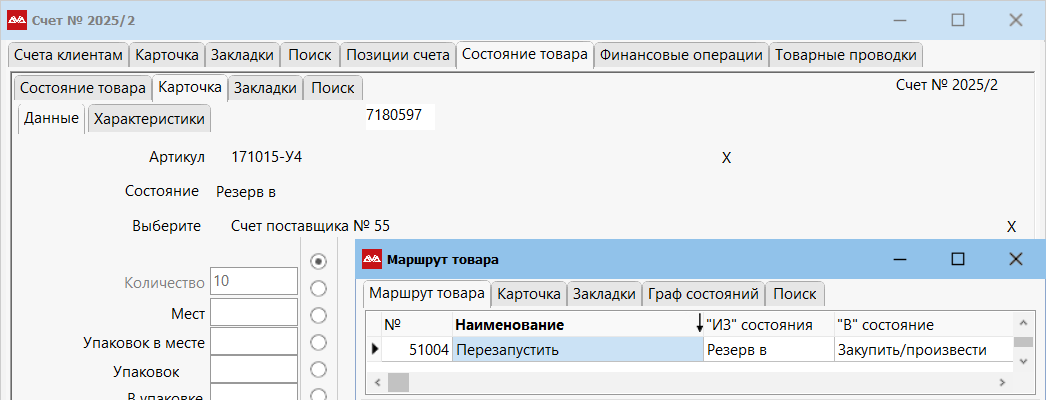Для этого заходим в «Состояние товара» в счете клиента, встаем на нужную позицию, нажимаем корректировать запись (F2) и выбираем движение «Перезапустить».