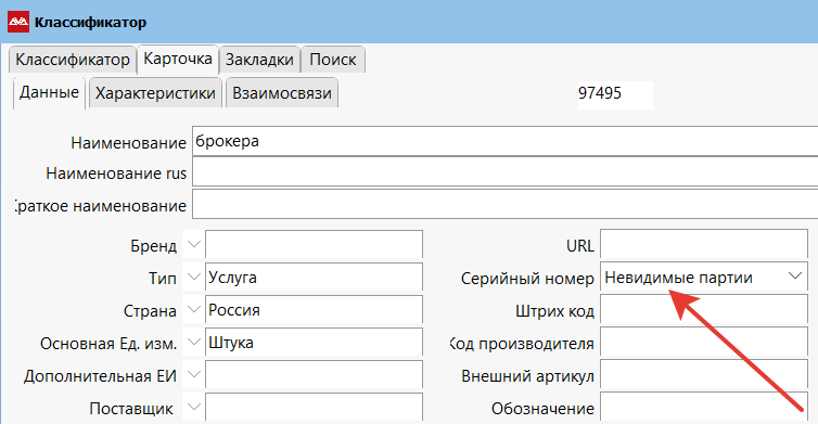 Внимание! Для того, чтобы услугу можно было принимать и учитывать частично в классификаторе в карточке товара признак серийности должен быть установлен «Невидимые партии».
