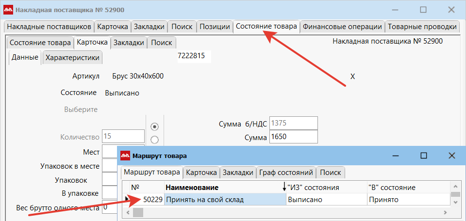 4.Открываем закладку «Состояние товара» и выполняем движение.