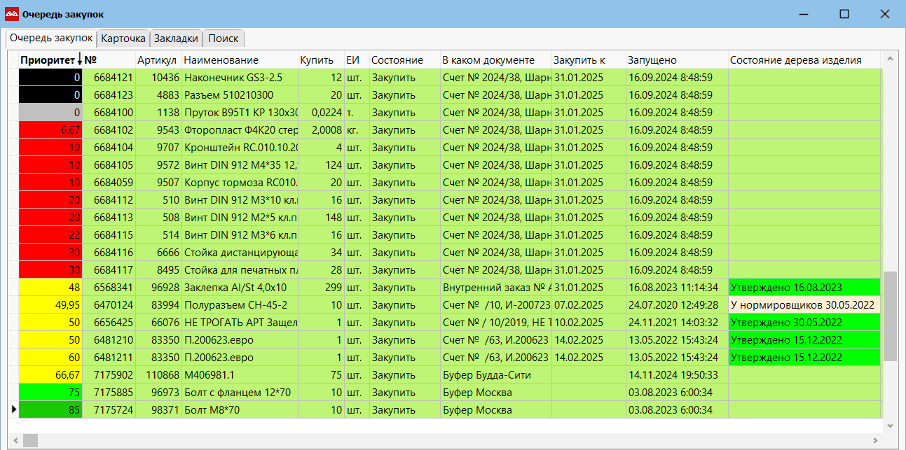 Очередь закупок отсортирована по степени важности закупок. То есть менеджер по закупкам заказывает поставщикам в той последовательности, в которой их выстроила система.