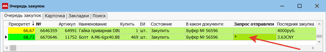 Запрос отправлен. Дабл клик в этой ячейке проставляет звездочку («*»), повторный дабл клик убирает звездочку. Это нужно для того, чтобы менеджер по закупкам для себя сделал пометку, что он запросил у поставщика предложение по этой позиции, но заказ еще не размещен.