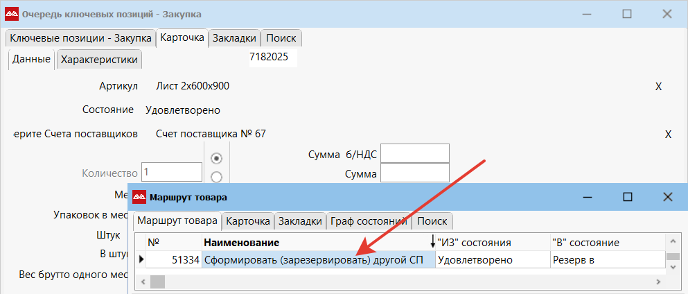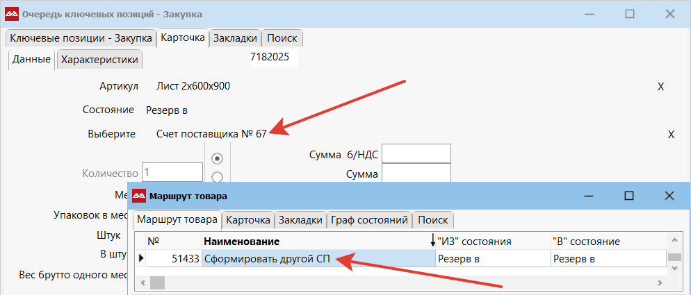 Затем снова нажимает корректировать запись (F2), выбирает движение «Сформировать другой СП» и заносит новый СП, тем самым перезаказывая позицию у другого поставщика. Сохраняет изменения.