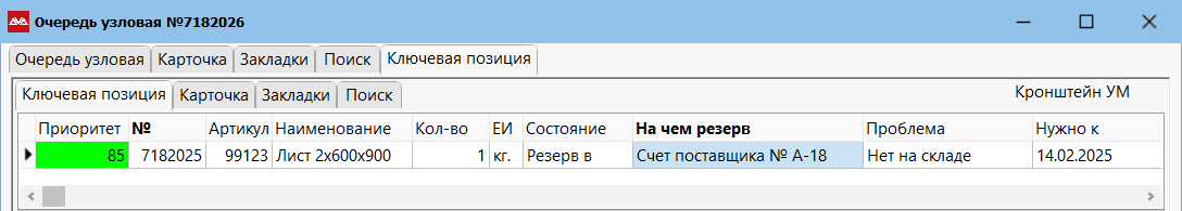 Рассмотрим пример, ключевая позиция (артикул 99123) нужна 14.02.2025. А закупка, которую она ожидает, приедет только 20.02.2025.