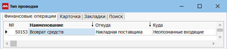 Если поставщик вернул нам деньги, то при импорте банковской выписки система оформит на эти деньги Входящий неопознанный платеж. На инвойсе, по которому мы вернули товар, нажимаем F8. Заносим новую запись. Выбираем фин операцию «Возврат денежных средств» (50153). Выбираем неопознанный входящий платеж. Сохраняем запись.