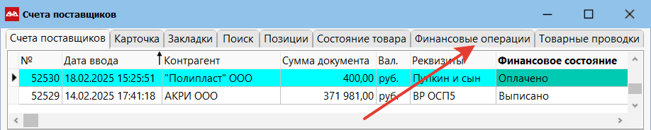 Позиционируйтесь на оплаченном счете поставщика (Главное меню → Закупки → Счета поставщиков), перейдите на вкладку «Финансовые операции» (F8).