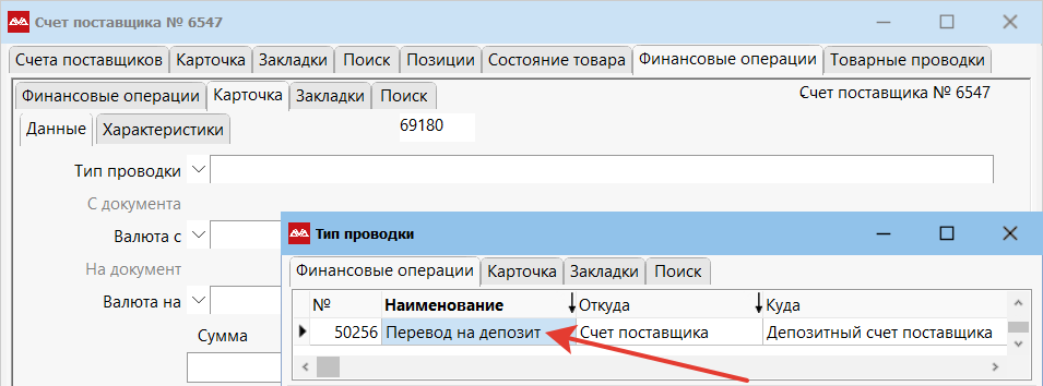 Занесите новую запись. Выберите финансовую операцию «Перевод на депозит» №50256.