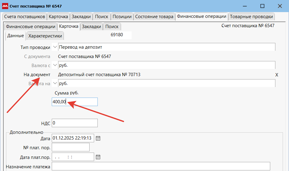 «Депозит поставщика» сохраниться и выберется в поле «На документ». Укажите сумму.