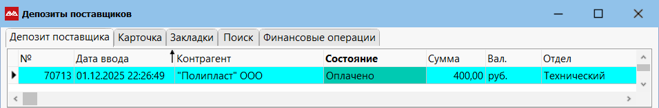 Чтобы посмотреть занесенный «Депозит поставщика», перейдите Главное меню → Закупки → Депозиты поставщиков.