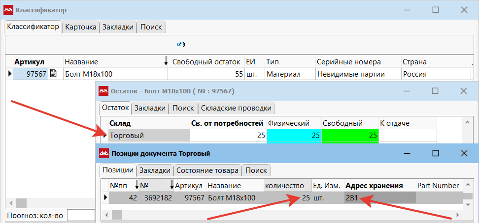Система покажет список товаров, находящихся на этом адресе хранения.