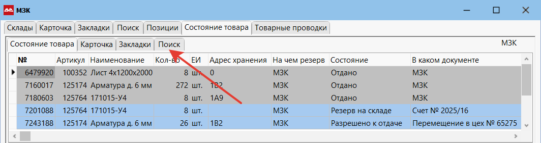 Чтобы увидеть какие товары и в каком количестве сейчас находятся на складе, перейдите Главное меню → Склад → Склады. Откроется список складов. Позиционируйтесь на нужном складе, нажмите F6 или перейдите на вкладку «Состояние товара».