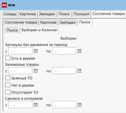 Залежалые товары. Показывает позиции, которые были на складе в указанный период, но не двигались в указанный период.
