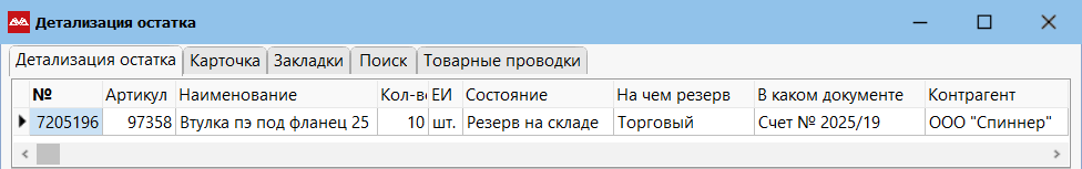 Система откроет форму детализации остатка, в которой покажет эту запись более детально, учитывая ваш доступ, то есть теоретически вы можете и не увидеть детализацию, если не имеете доступа к этому документу.