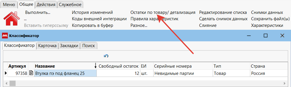 Посмотреть детализацию по всем остаткам товара можно запустив пункт меню «Остатки по товару/детализация» (кнопка F9).