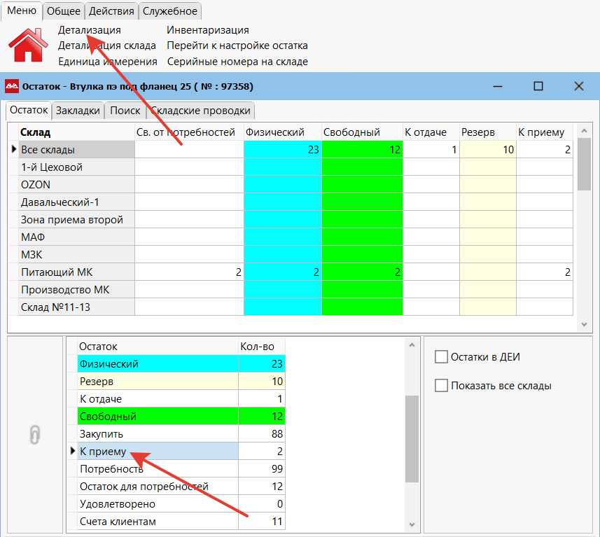 Откроется форма остатков. Теперь установите фокус в нижнем подвале на нужном остатке (Закупается, резерв, к приему и так далее). Запустите пункт меню «Детализация».