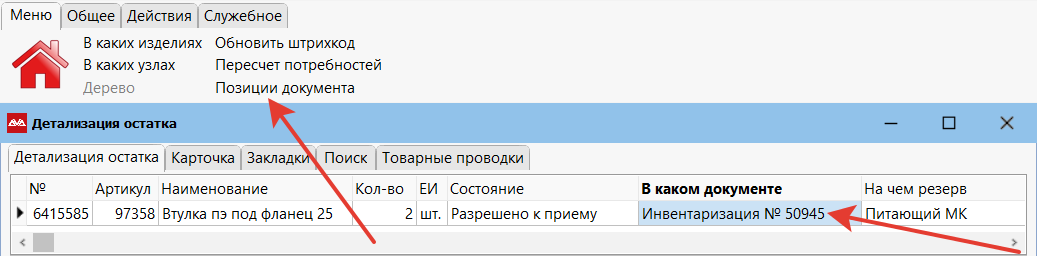 Из детализации остатка вы можете перейти в позиции документа (пункт меню «Позиции документа»).