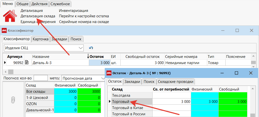В окошке «Остаток» выбираем склад, с которого хотим переместить товар. На картинке выбран склад «Торговый» с остатком товара 3000шт. Нажимаем Меню → Детализация склада.