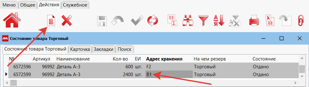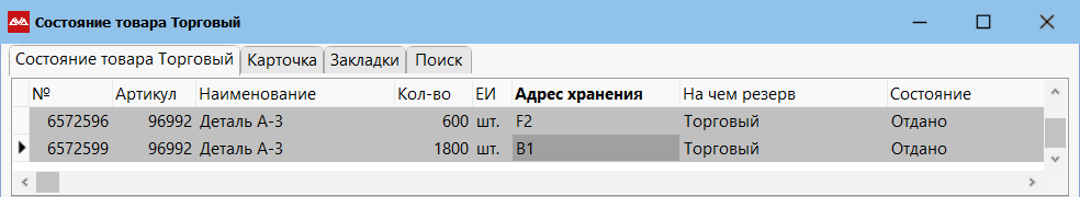 На картинке видно, что на «Торговом» складе по адресу хранения F2 лежит 600шт. товара, а по адресу B1 количество товара уменьшилось до 1800шт.