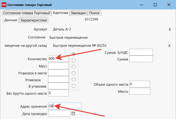 Для примера, переместим 600шт. товара по адресу G8. Сохраняем, откроется окошко.