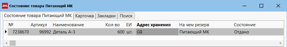 Так же можно посмотреть детализацию склада, на который переместили товар. На картинке видим, что товар перемещен на склад приемник по адресу G8: