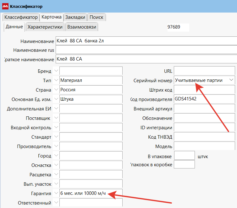 Этот функционал необходим, когда вы используете материалы, у которых строго ограничен срок годности и их нельзя использовать по окончании этого срока. Например, клеи, компаунды и так далее. Чтобы начать использовать этот функционал, необходимо на карточке этого наименования в классификаторе установить признак «Учитываемые партии», а также указать срок годности.