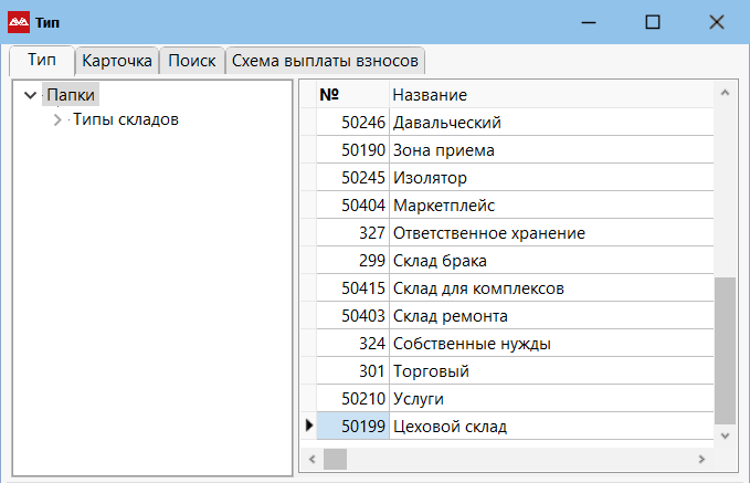 Откроется список складов. Занесите новую запись. Откроется список типов складов, как показано ниже.