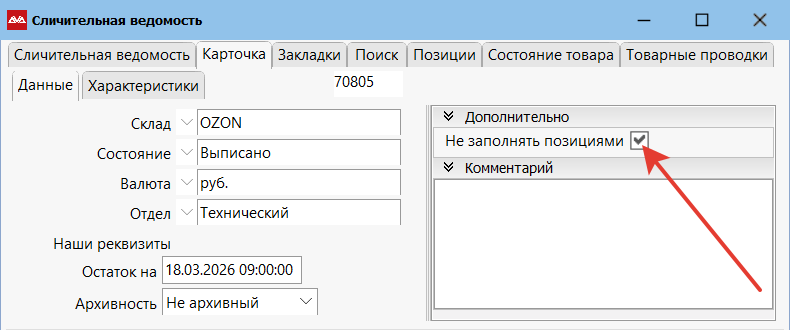 Если установить галочку «Не заполнять позициями», то сличительная ведомость не заполнится автоматически остатками на дату (используется при импорте позиций сличительной ведомости из Excel).