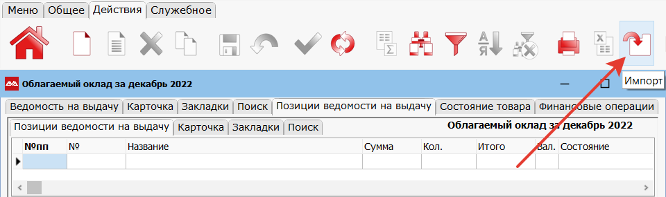 Переходим в позиции ведомости и нажимаем кнопку «Импорт».
