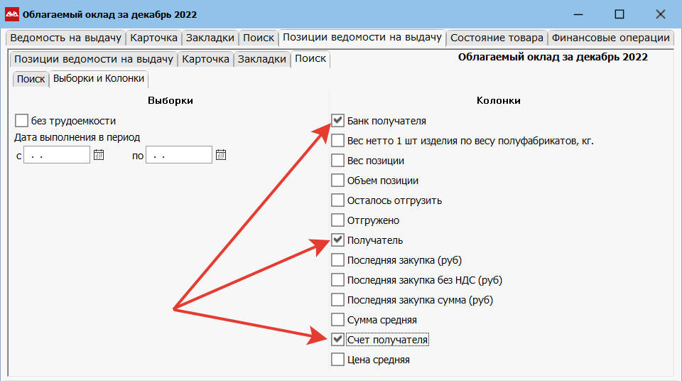 Находясь на ведомости, можно посмотреть на какие реквизиты сотруднику будет перечислена заработная плата. Для этого находясь в позициях зарплатной ведомости, в «Поиске», перейдем на вкладку «Выборки и колонки». Отметим галками «Банк получателя», «Получатель» и «Счет получателя».