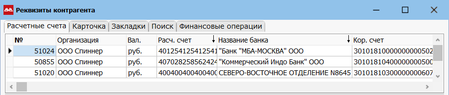 - Если поля «Наименование» (на карточке расчетного счета) и «Краткое» (на карточке банка) не будут заполнены, то будет выводиться полное название банка плюс четыре последние цифры счета, например, «Банк «МБА-МОСКВА» ООО 5412».