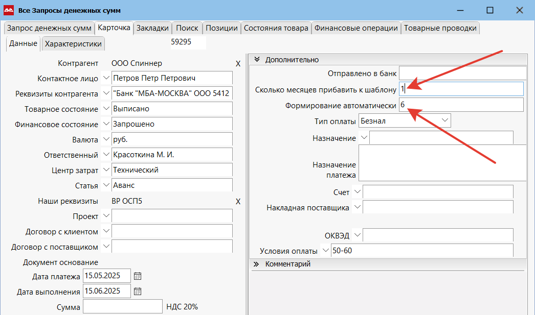 Если указать дату платежа, то будет создан ЗДС, в котором дата платежа и дата выполнения будут отличаться на месяц от шаблона. Например, 01.06.2025 будет создан ЗДС с датой платежа 15.06.2025 и датой выполнения 15.07.2025.